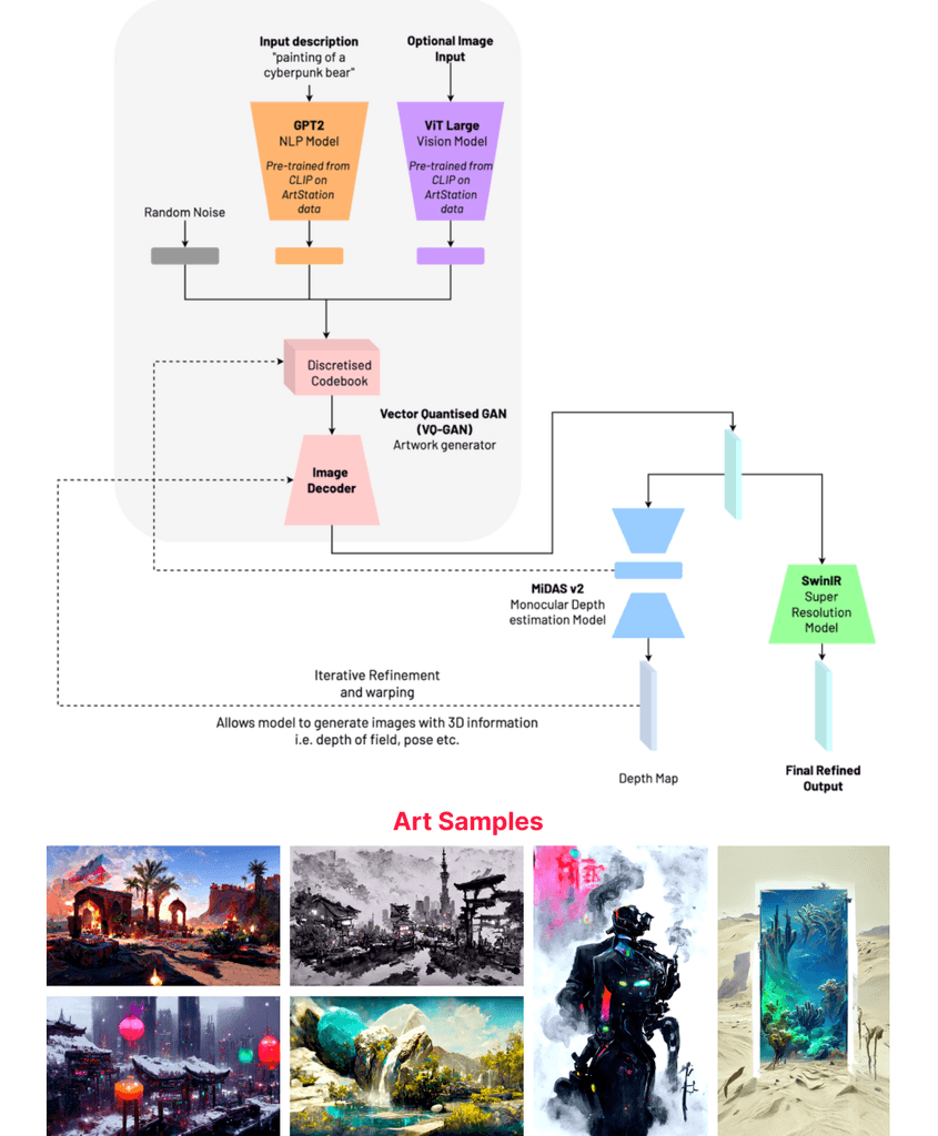 To that extent I created a text-to-image art generative model by piecing together popular works from visual-language learning (like CLIP), generative modelling (like VQ-GAN), super-resolution (like SwinIR) and depth modelling (like MiDAS). Trained on Artstation data for just 3 days, achieving high semantic quality output art